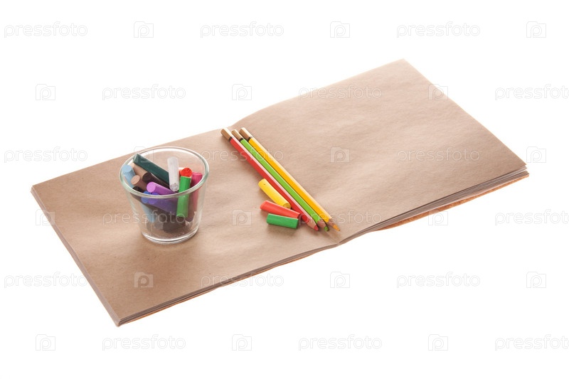 Цветные карандаши и мелки в стеклянном стаканчике лежат на раскрытой тетради