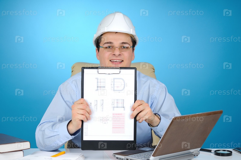 Инженер с белой жесткой шляпой, держащий в руках клипборд