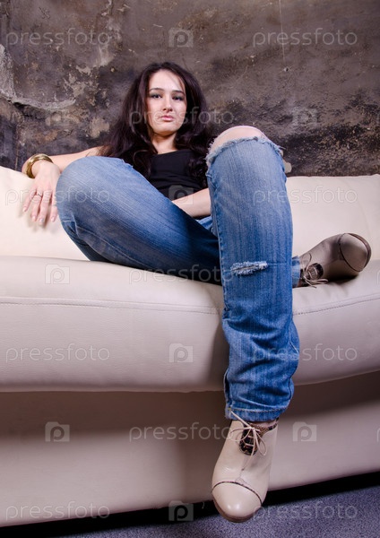Молодая женщина сидит на диване
