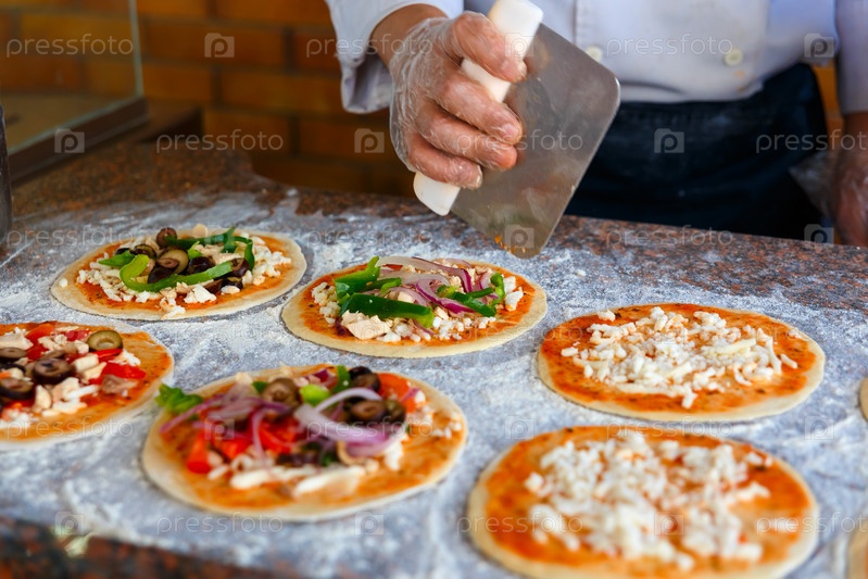 Шеф-повар кладет начинки на пиццу