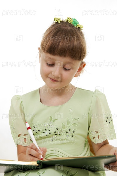 Маленькая девочка делает записи в тетради на белом фоне