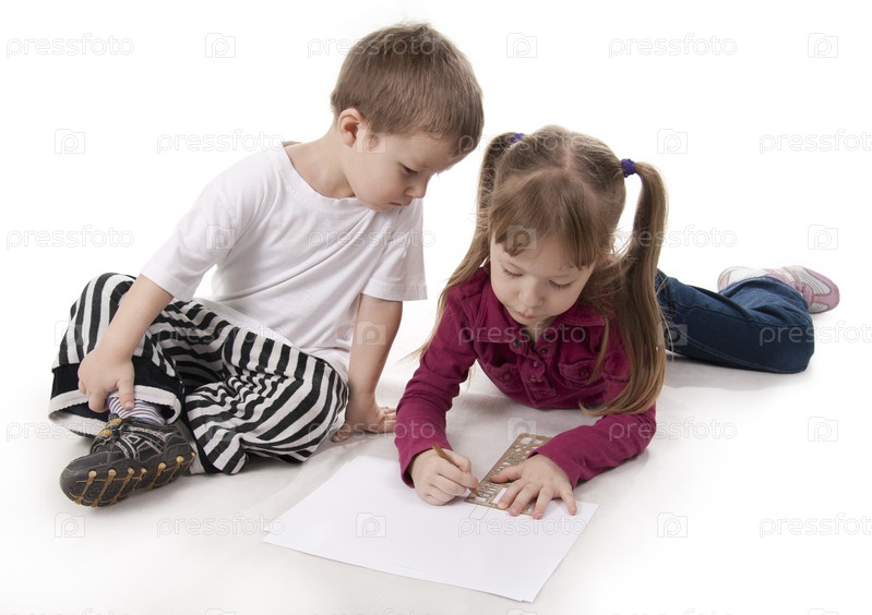 Маленький мальчик и его сестра рисуют, лежа на полу