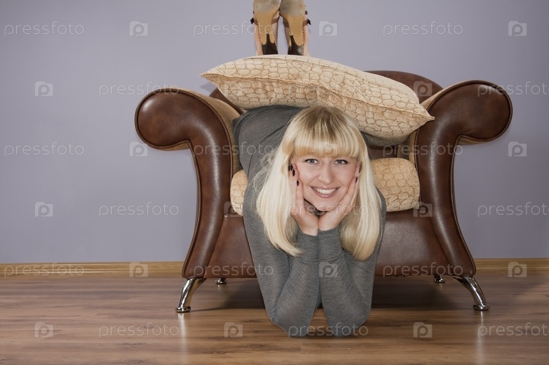 Веселая молодая женщина в кресле