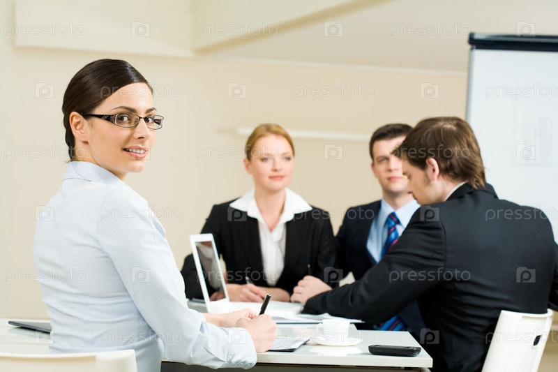 Портрет бизнесменов, работающих с умным работодателем, сидящих в стороне и смотрящих на камеру