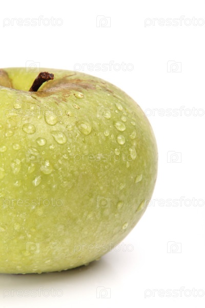 Фрагмент зеленого яблока с каплями воды на белом фоне