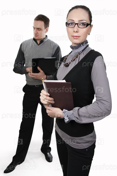 Женщина и мужчина в деловой одежде на белом фоне