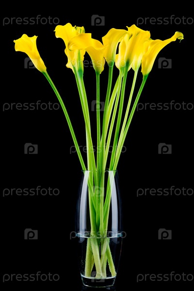 Букет из калл в вазе на черном фоне