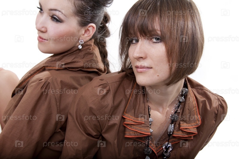 Две девушки демонстрируют коллекцию одежды на белом фоне
