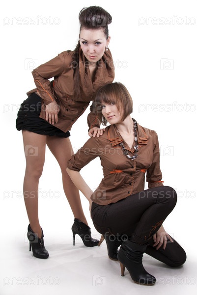 Две девушки демонстрируют коллекцию одежды на белом фоне