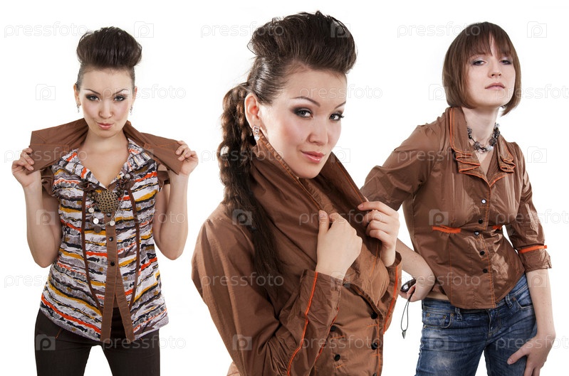 Девушки демонстрируют коллекцию одежды на белом фоне