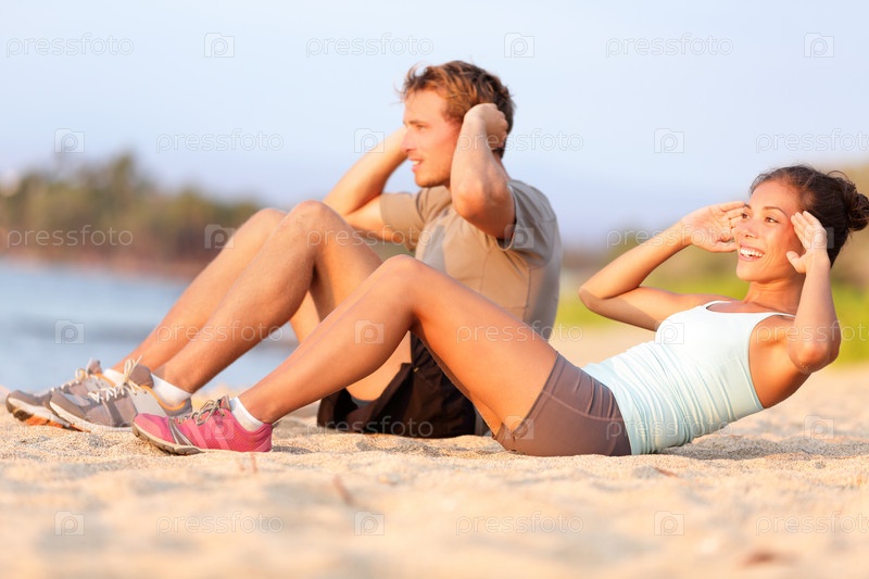 Люди качают пресс на пляже