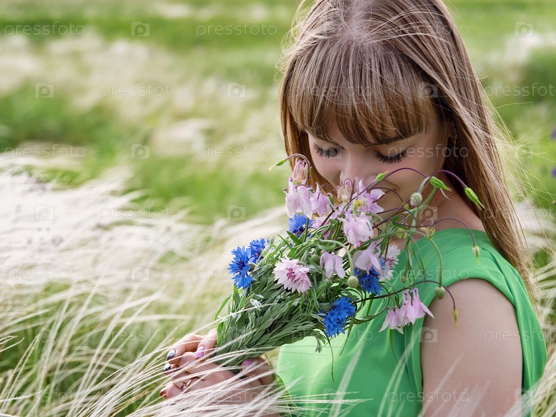 Девушка нуюхает букет полевых цветов