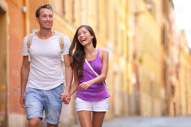 Молодая пара идет, держась за руки