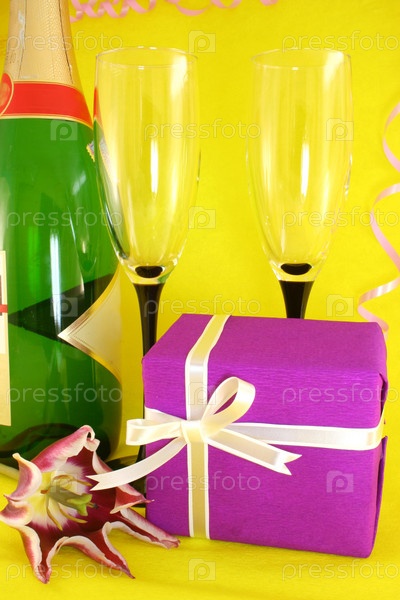 Бутылка шампанского, два бокала и подарок