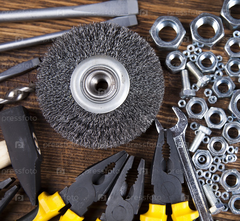 Рабочие инструменты на деревянном фоне