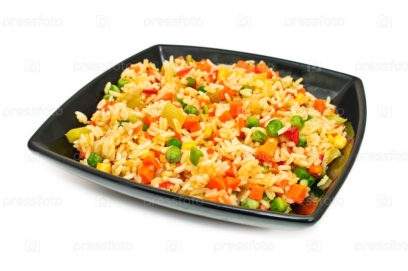 Черная тарелка с салатом из риса и овощей. Изолирована на белом фоне