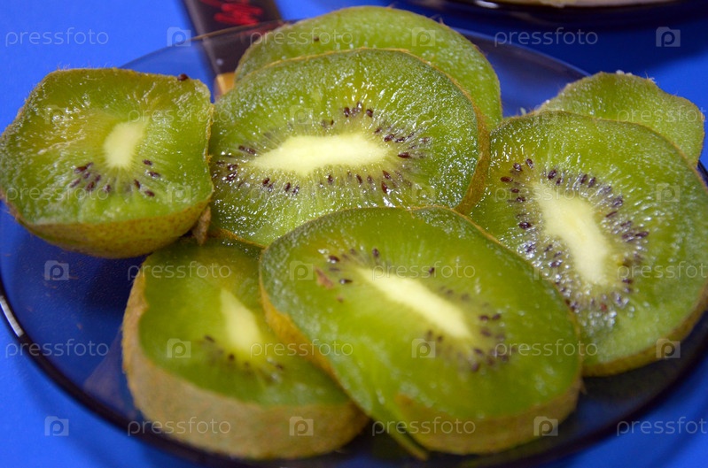 Дольки киви на стеклянной тарелке на синей скатерти. Крупный план