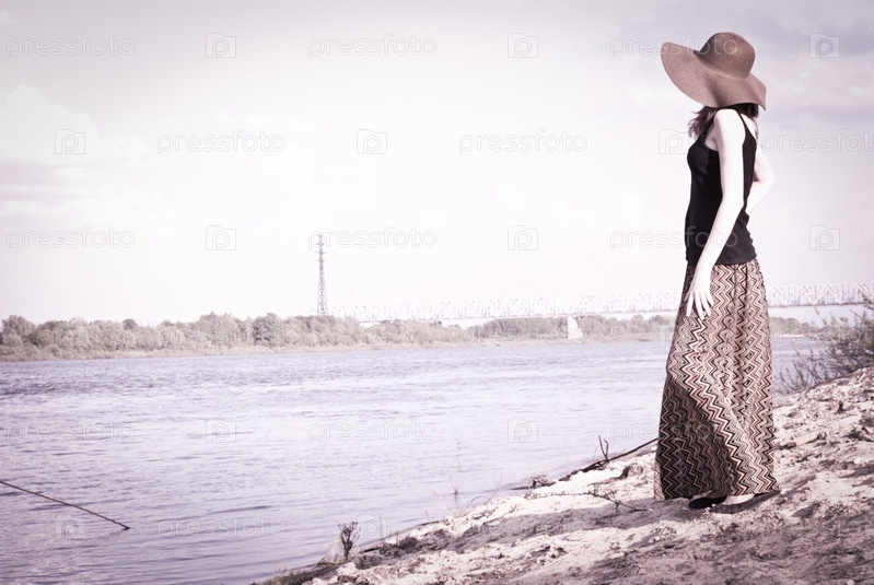 Черно-белая фотография. Девушка в шляпе у реки. Поля шляпы закрывают девушке лицо