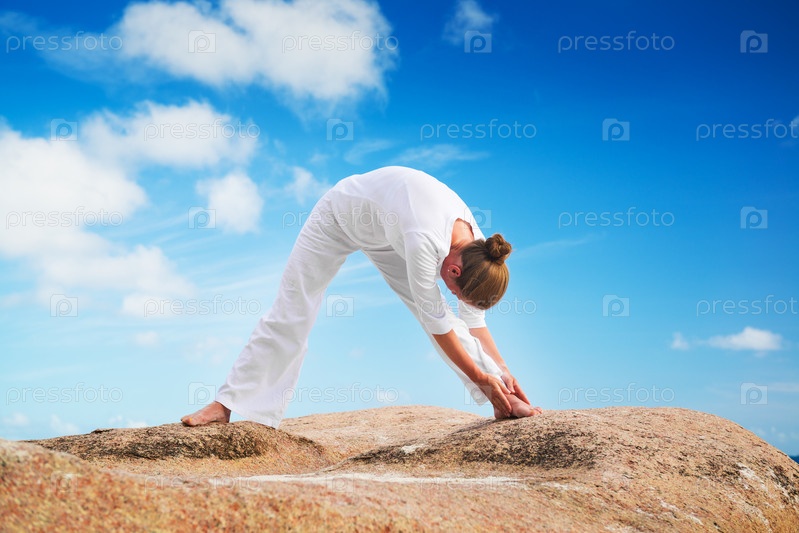 Молодая женщина занимается йогой на пляже