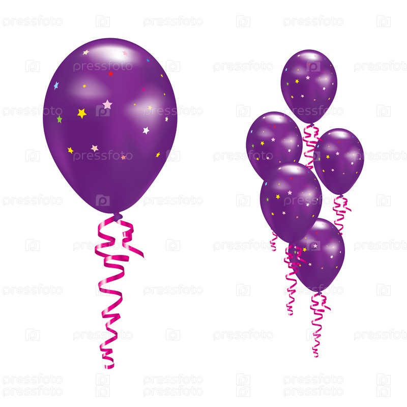 Фиолетовые шарики со звездочками и лентами на белом фоне
