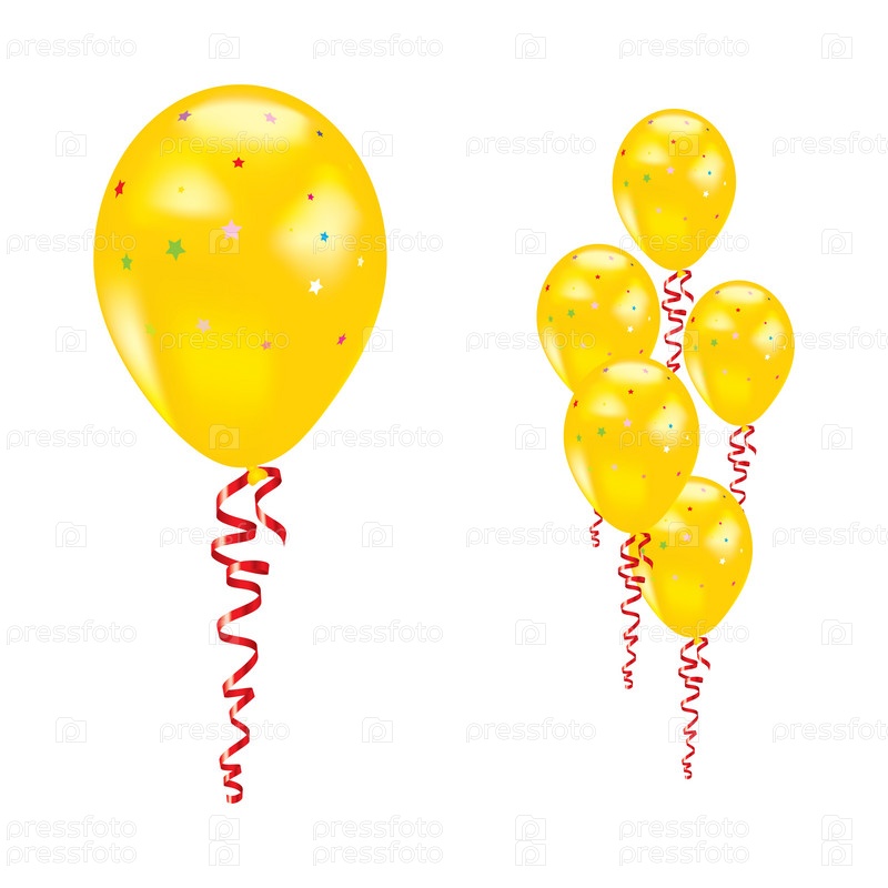 Желтые шарики со звездочками и лентами на белом фоне