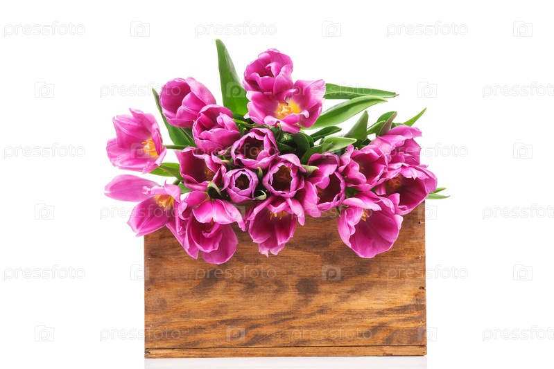 Тюльпаны в ящике на белом фоне