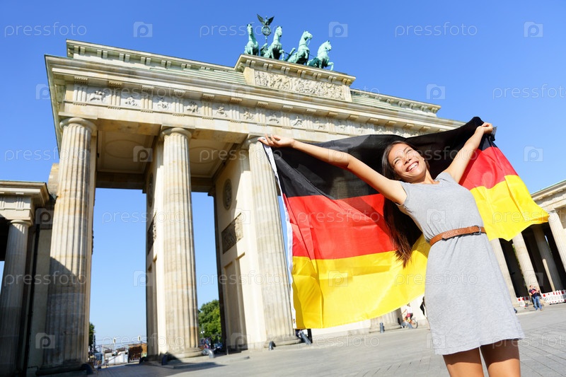 Женщина с немецким флагом у Бранденбургских ворот