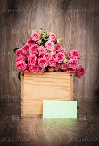 Розы в ящике на деревянном фоне