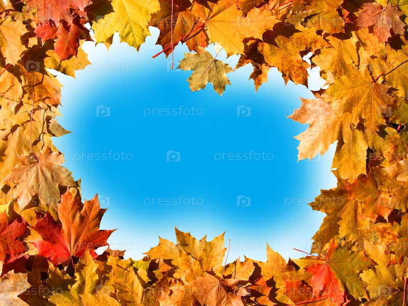 Рамка из осенних кленовых листьев на голубом фоне