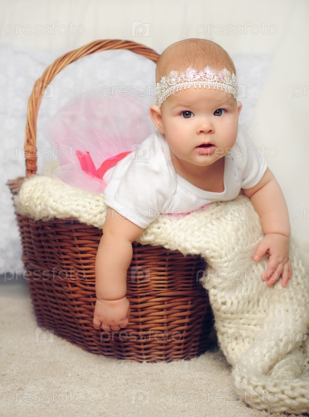 Кареглазая девочка сидит в корзине