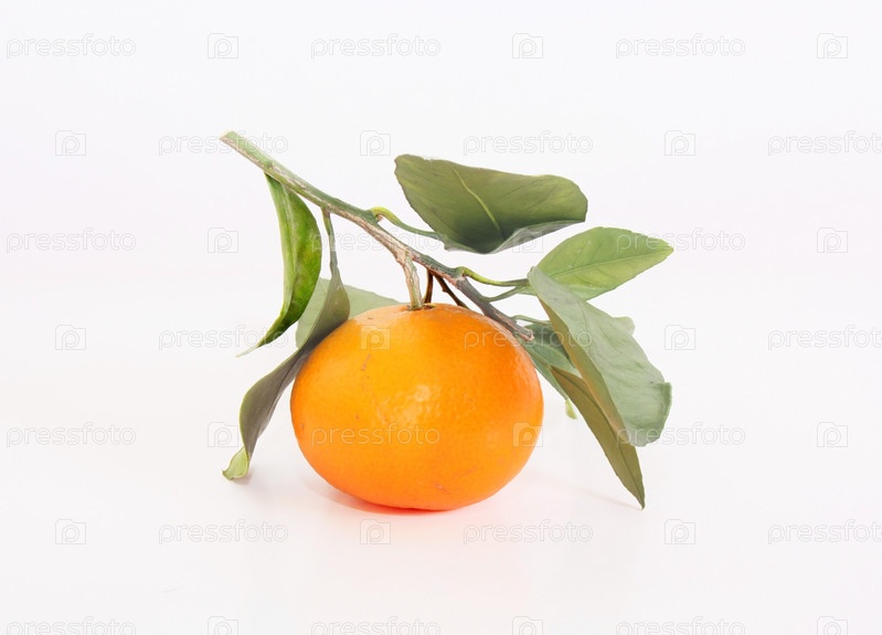 Оранжевый мандарин на зеленой ветке крупным планом на белом фоне