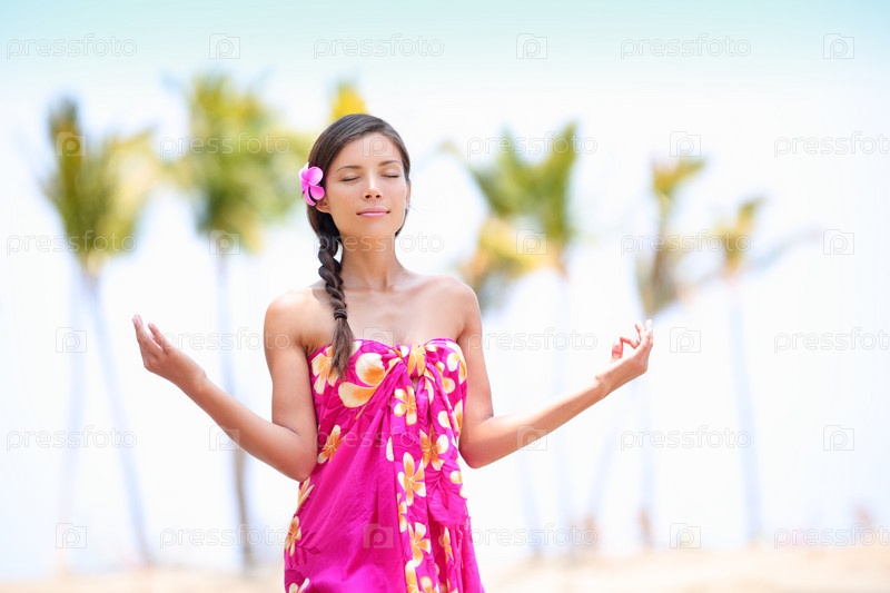 Женщина медитирует на пляже