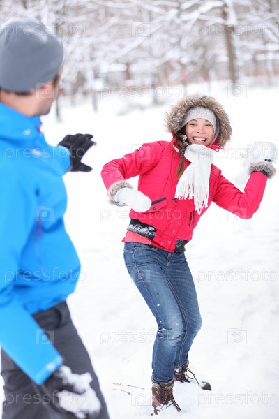 Молодая пара играет в снежки