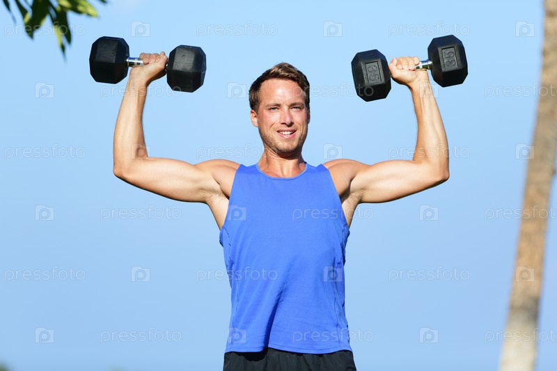 Мужчина поднимает гантели