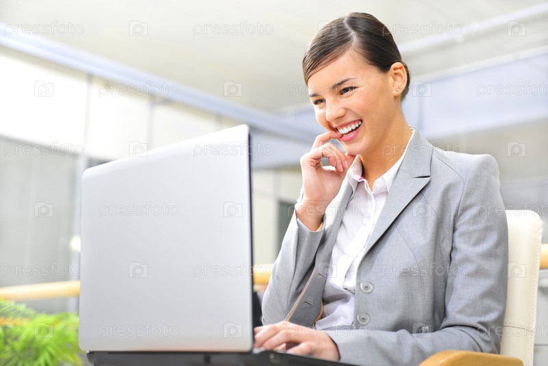 Портрет молодой бизнес-леди, работающей на ноутбуке в офисе