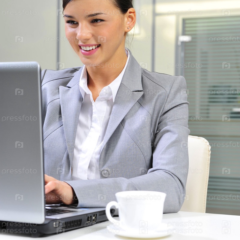 Портрет молодой бизнес-леди, работающей на ноутбуке в офисе