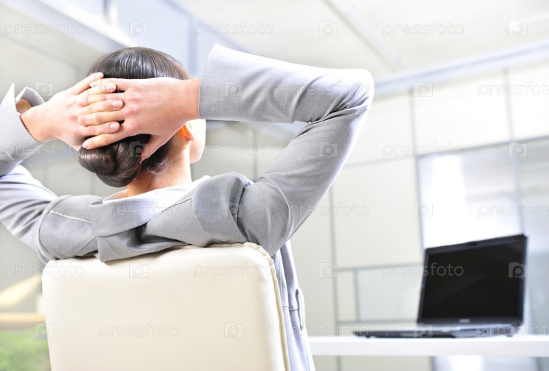 Молодая бизнес-леди с ноутбуком, сидящая спиной за столом в офисе