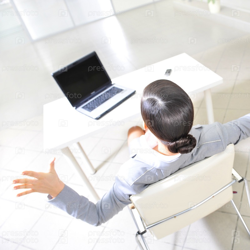Молодая бизнес-леди с ноутбуком, сидящая спиной за столом в офисе