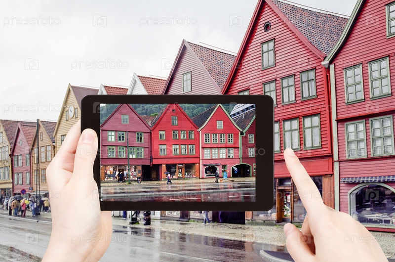Турист фотографирует набережную Брюгген в Бергене