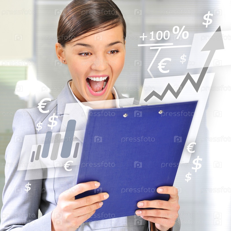 Портрет молодой улыбающейся бизнес-леди с документами в руках