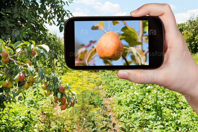 Человек фотографирует грушу