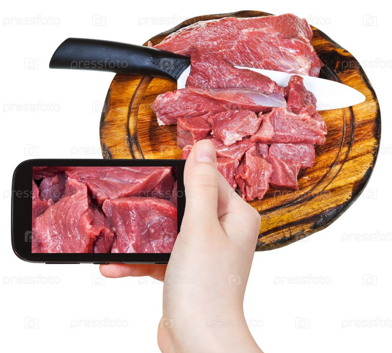 Человек фотографирует куски сырого мяса