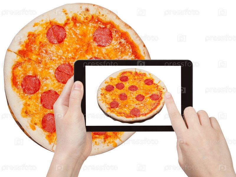 Человек фотографирует пиццу с салями