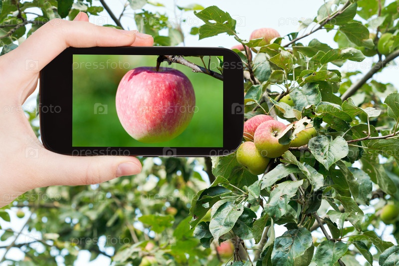 Человек фотографирует яблоню