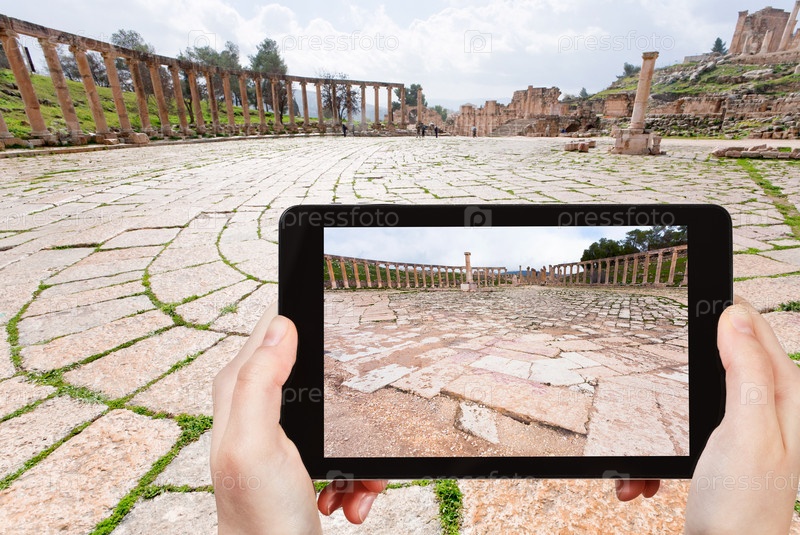Человек фотографирует римский овальный форум в Джераше
