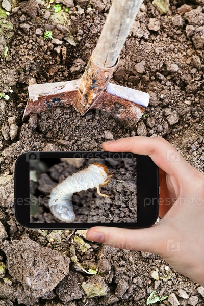 Человек фотографирует личинки хруща в саду