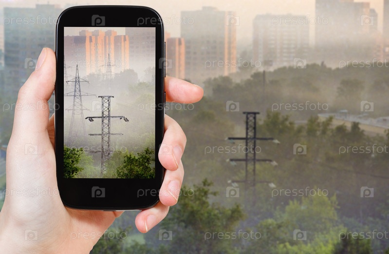 Человек фотографирует туман в городе