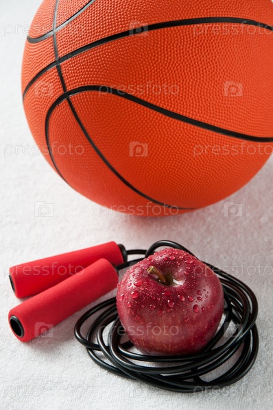 Свежее яблоко, скакалка и баскетбольный мяч на белом полотенце