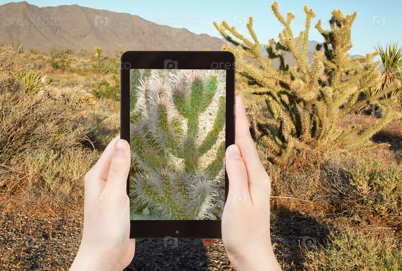 Человек фотографирует кактус в пустыне Мохаве