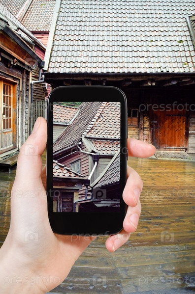 Человек фотографирует деревянные дома, Берген